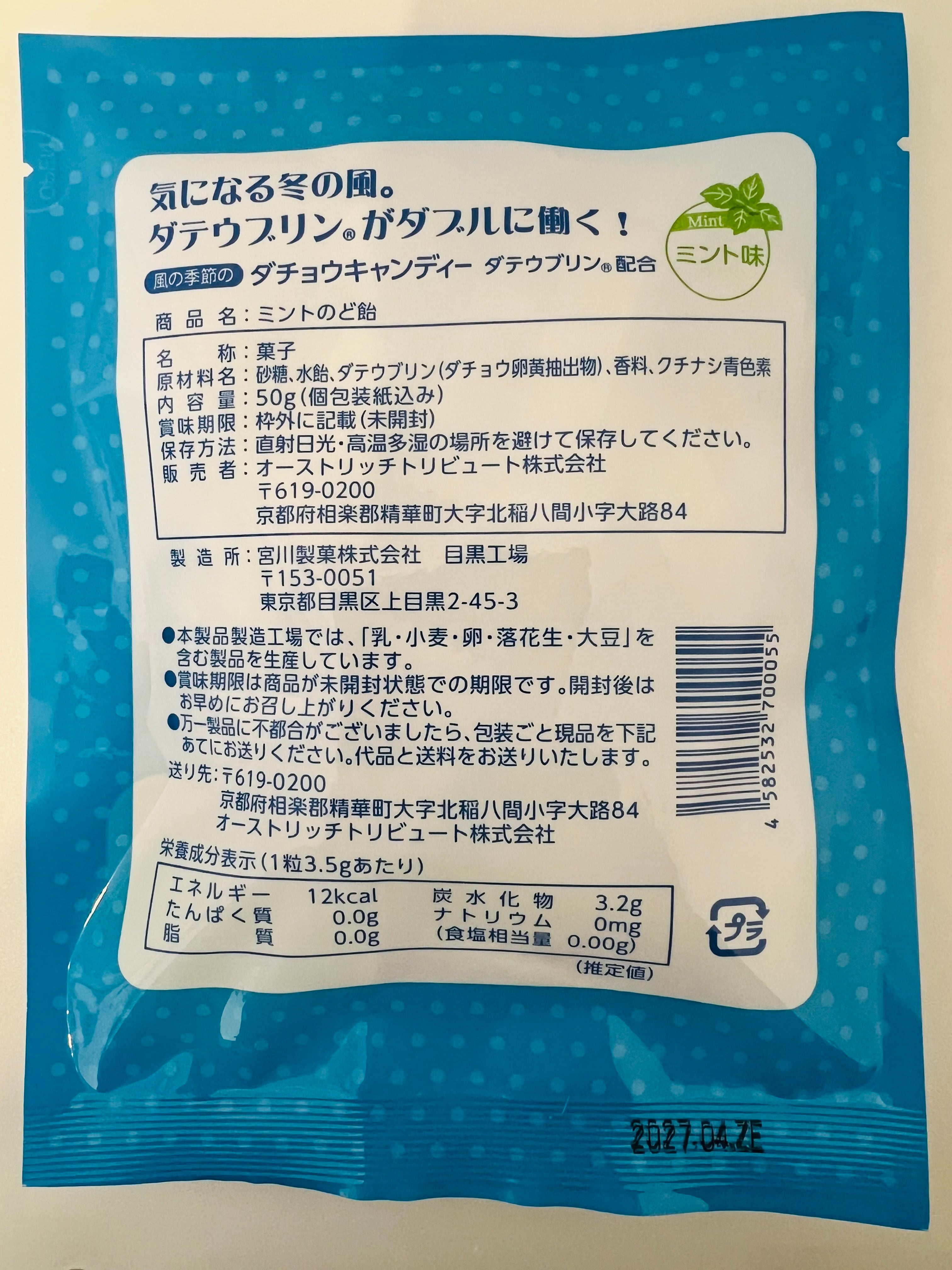 ◉ダチョウキャンディー・ミント味は、これまでの風の季節のダチョウキャンディーに、+ダチョウに秘められたパワー“ダテウブリン”が新配合!